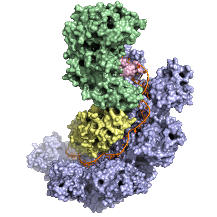 The image is a computational model of a CRISPR-associated protein complex called Cascade, from the bacterium E. coli. Bacteria use short DNA sequences (CRISPR) to identify attacking viruses. The model here shows proteins as colored clumps that have recognized an unwound piece of viral DNA, nestled in a channel in the complex. The model, created by Douglas Renfrew of the Flatiron Institute’s Center fo Computational Biology, is based on the paper “Crystal Structure of a CRISPR RNA–Guided Surveillance Complex Bound to a ssDNA Target,” by Sabin Mulepati, Annie Héroux, and Scott Bailey, published in Science in 2014. The molecule is listed in the Protein Data Bank as 4QYZ.