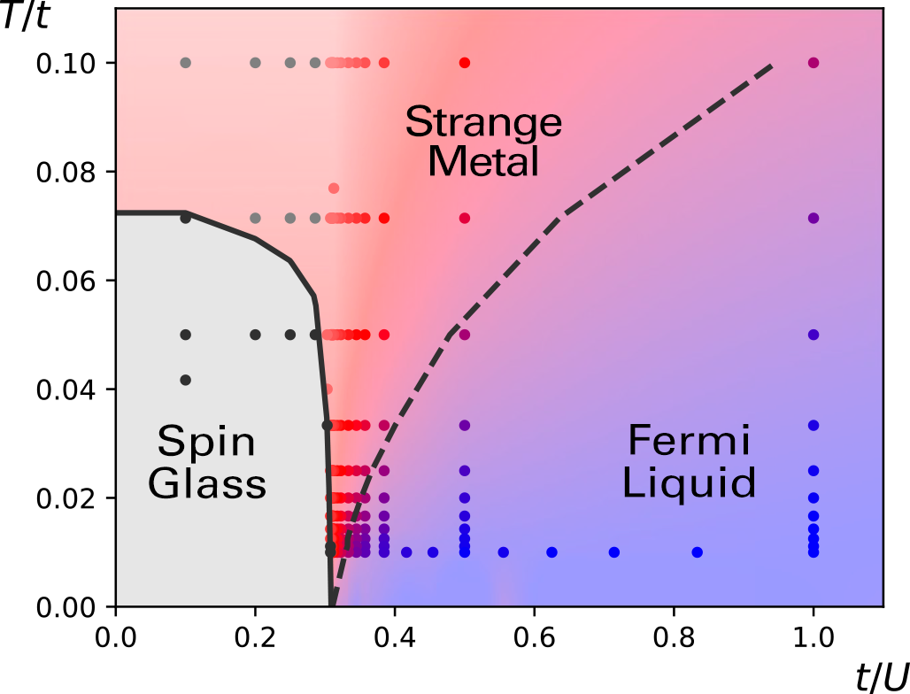 The resulting theoretical model reveals the existence of strange metals as a new state of matter bordering two previously known phases of matter: Mott insulating spin glasses and Fermi liquids. “We found there is a whole region in the phase space that is exhibiting a Planckian behavior that belongs to neither of the two phases that we’re transitioning between,” Kim says. “This quantum spin liquid state is not so locked down, but it’s also not completely free. It is a sluggish, soupy, slushy state. It is metallic but reluctantly metallic, and it’s pushing the degree of chaos to the limit of quantum mechanics.”